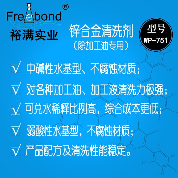 堿性鋅合金清洗劑|堿性鋅合金脫脂除油劑|裕滿清洗劑WP-751是一款以表面活性劑為主要成份的水基清洗劑;本品能夠徹底的清除工件表面的各種加工油、加工液等臟污,具有清洗力強(qiáng)、性能穩(wěn)定、綜合成本低、不腐蝕材質(zhì)等優(yōu)點(diǎn)。